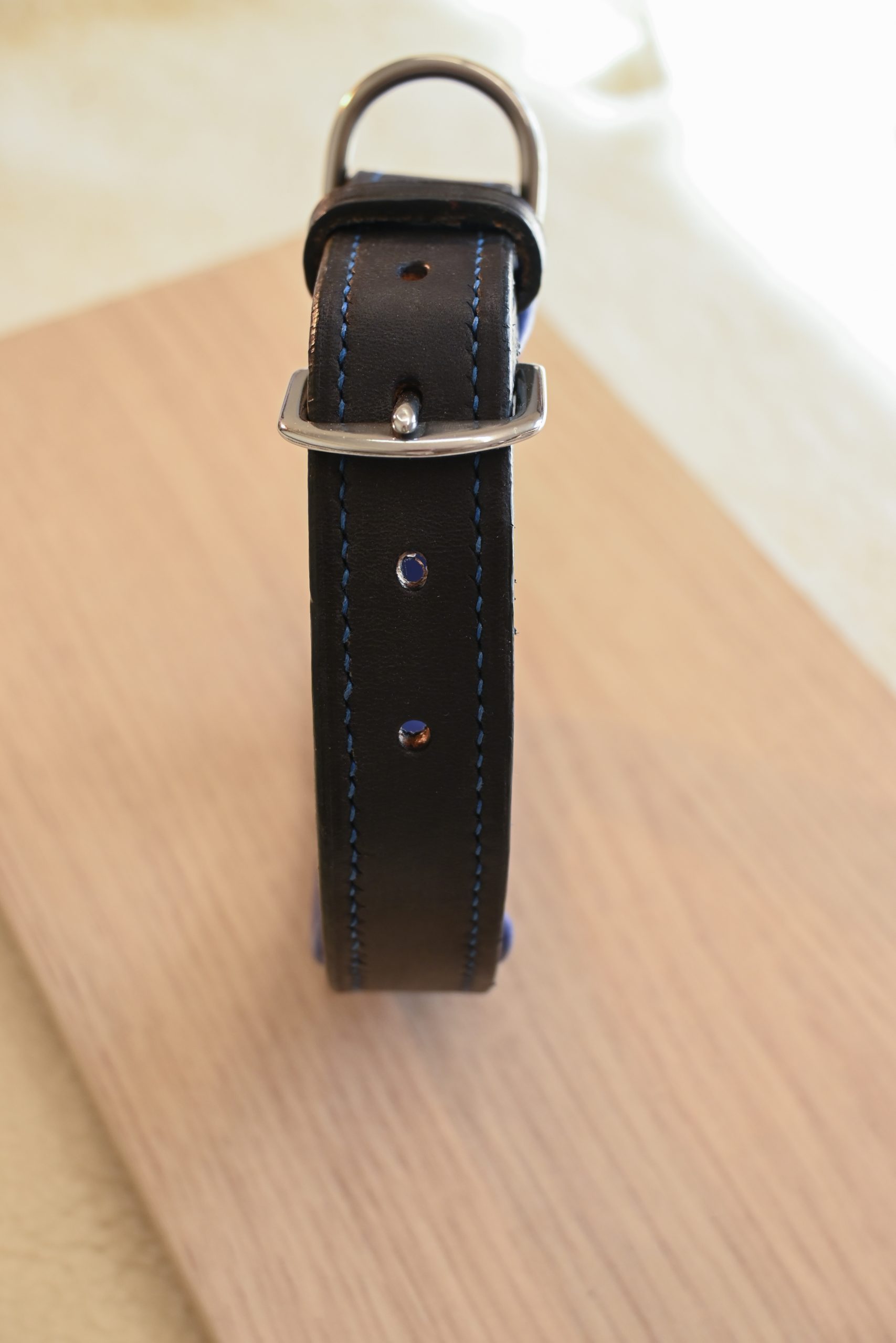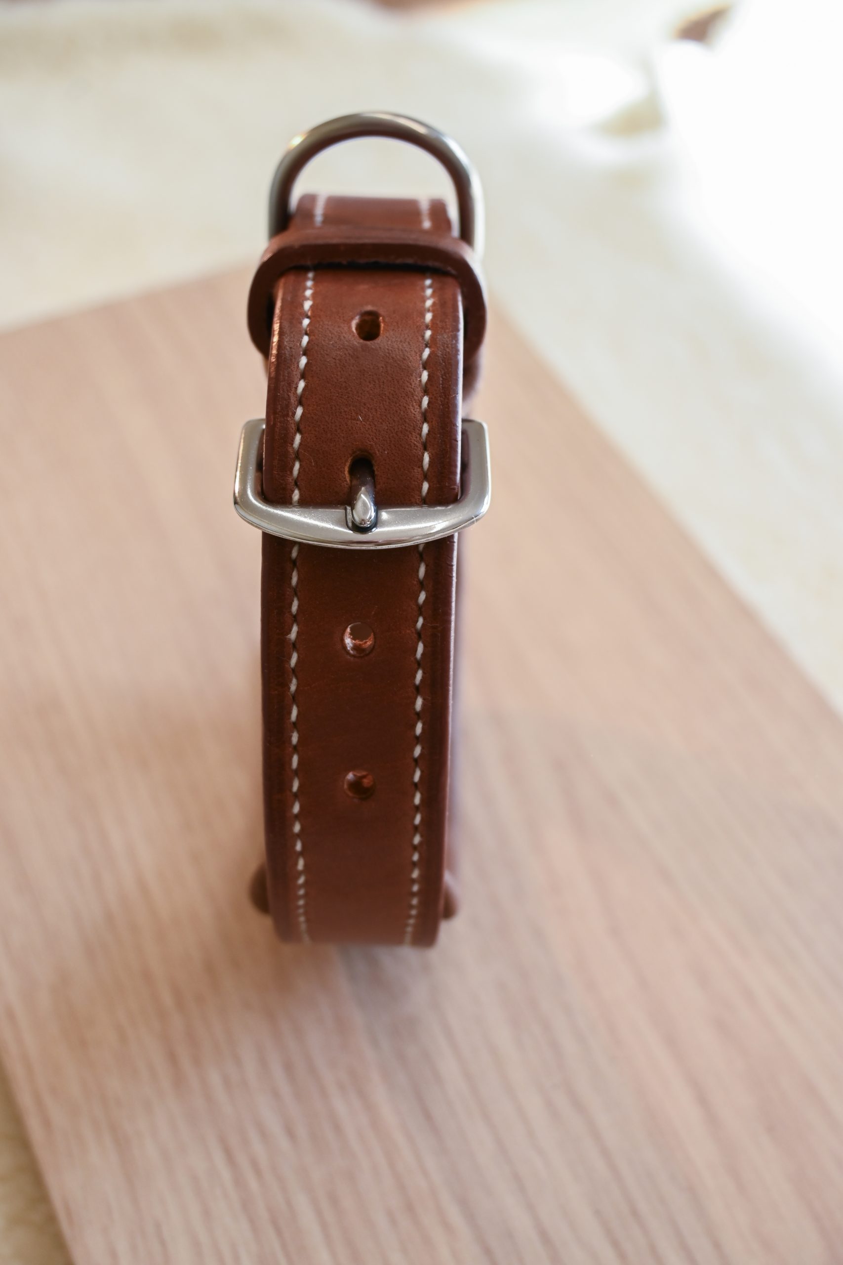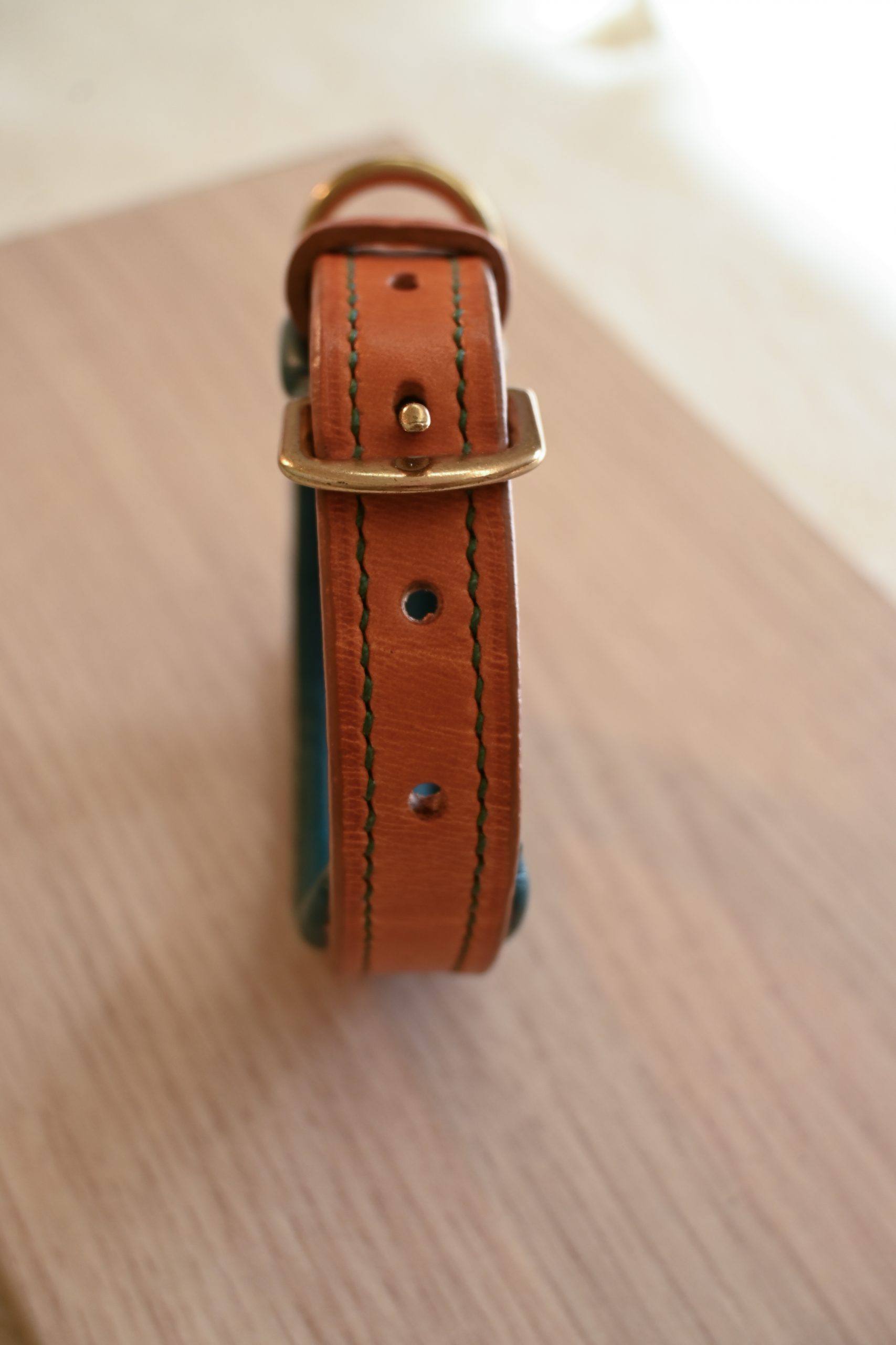 La ligne reste sobre, mais la finition témoigne du soin apporté à chaque pièce : une coupe nette, des tranches polies et teintées à la main, une couture main pour souligner le travail d’artisanat. Le collier Velours est une pièce à la fois fonctionnelle, durable et résolument élégante.