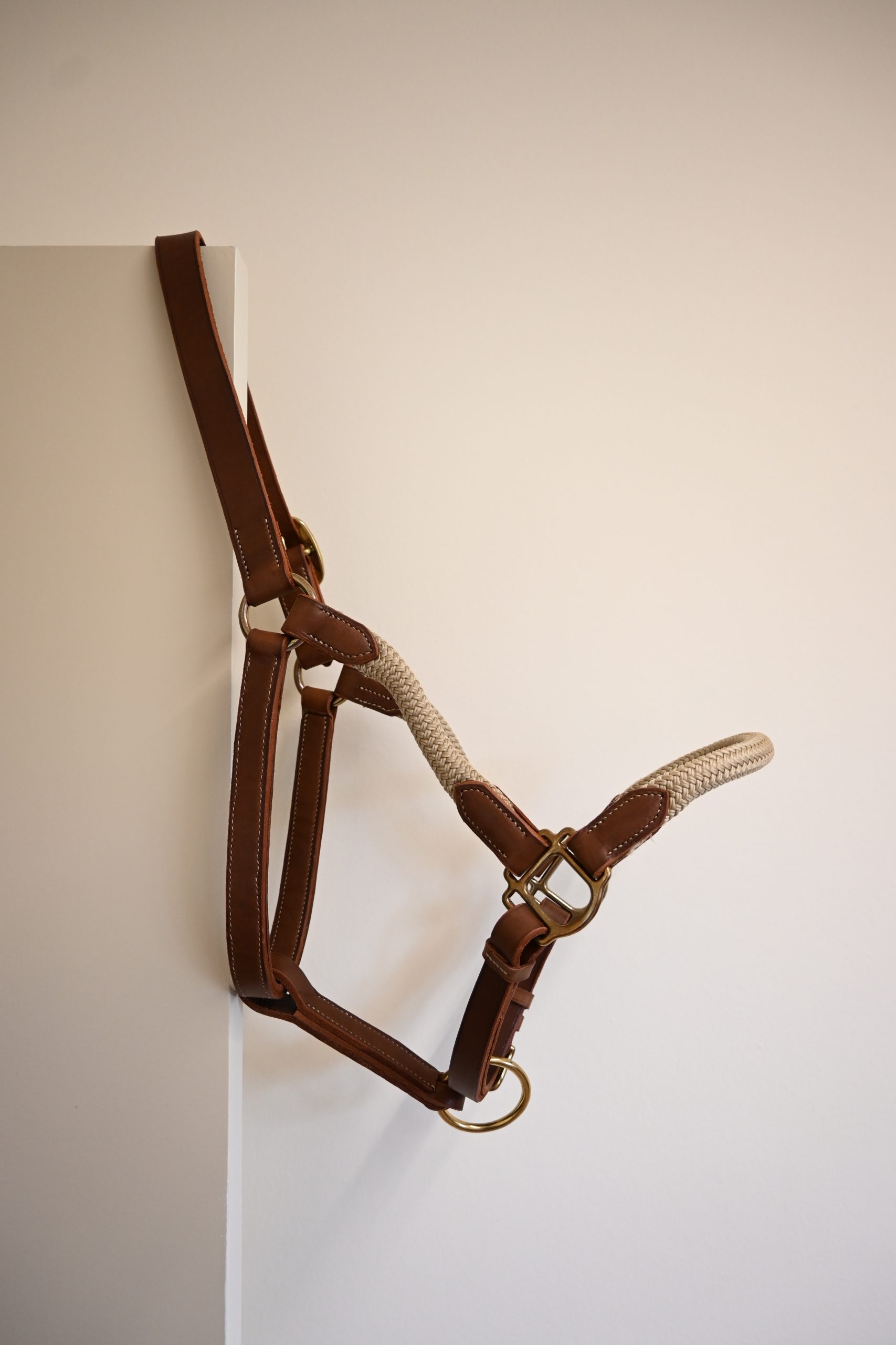 Le cuir utilisé est tanné végétal, sélectionné pour sa robustesse et sa capacité à se patiner avec le temps. Son absence de produit chimique dans le procéder de tannage diminue grandement les risques de réaction allergique. La corde, douce mais résistante, épouse la morphologie du cheval sans le blesser. Les coutures sont réalisées à la main au point sellier, avec un fil de lin ciré, pour une finition impeccable et durable. L’ensemble crée une silhouette à la fois raffinée et moderne, parfaite pour sublimer la tête du cheval sans la contraindre.